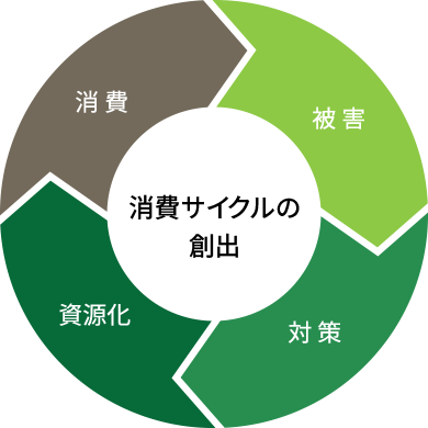 野生鳥獣による農作物への被害問題を解決するためには、被害→ 対策 → 資源化 → 消費のサイクルをつくり、さらにそれを日本全国に展開していくことが重要です。